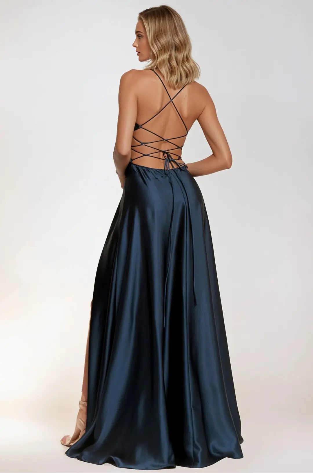 | Vestido largo de satén con escote redondo, tirantes delgados, espalda estilo corset abierto y abertura en la pierna. Elegante y moderno para graduaciones y eventos de gala. |