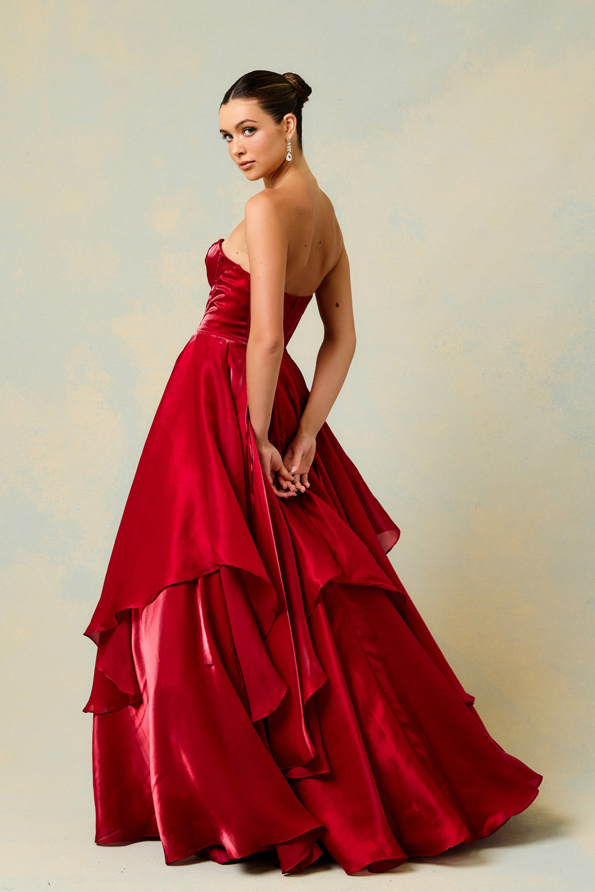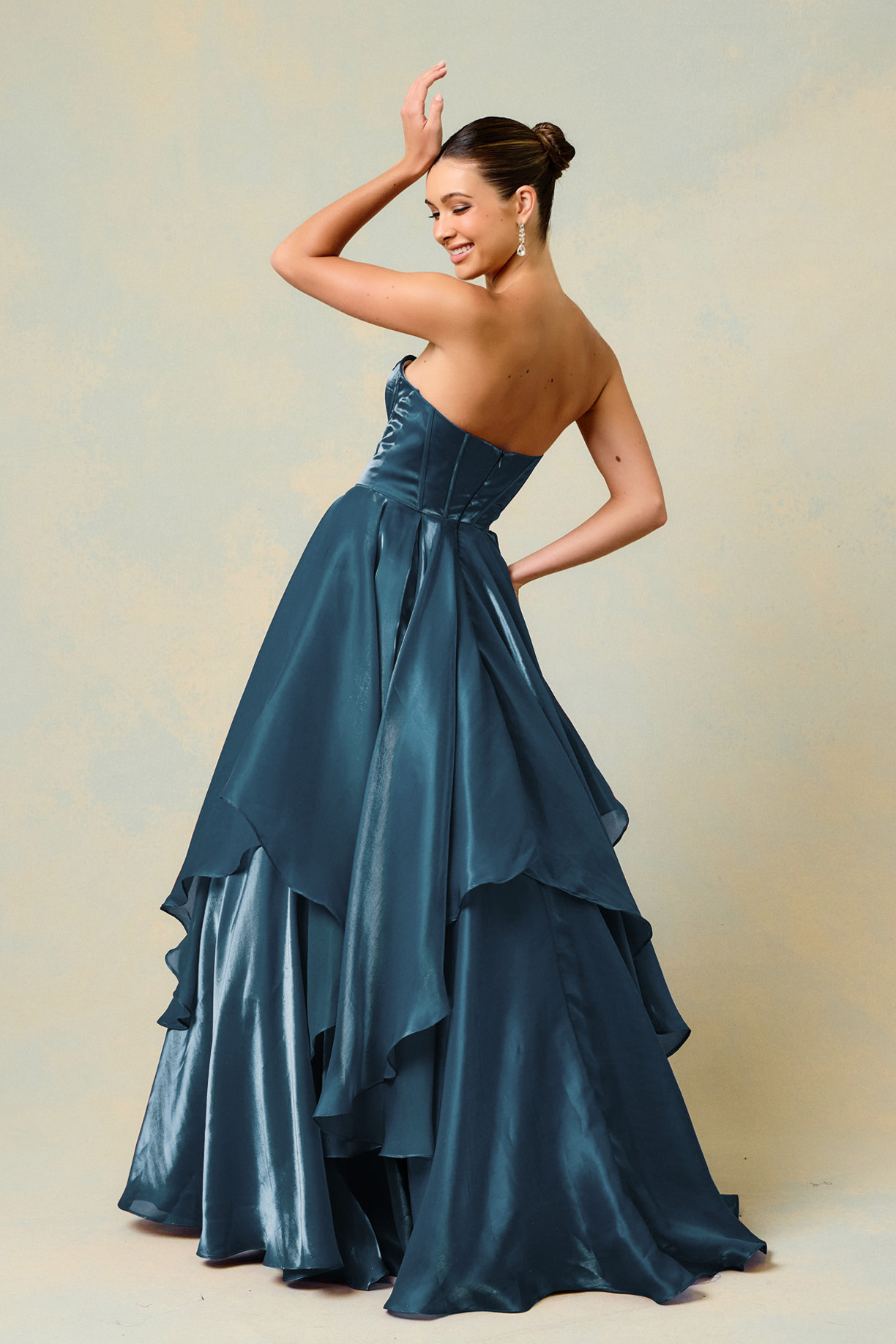 | Vestido elegante de fiesta con diseño tipo princesa, escote corazón strapless y falda amplia, ideal para graduaciones y ocasiones especiales. |