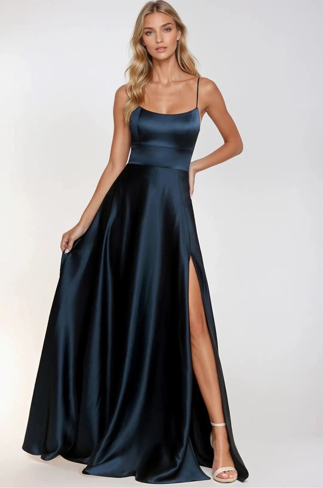 | Vestido largo de satén con escote redondo, tirantes delgados, espalda estilo corset abierto y abertura en la pierna. Elegante y moderno para graduaciones y eventos de gala. |