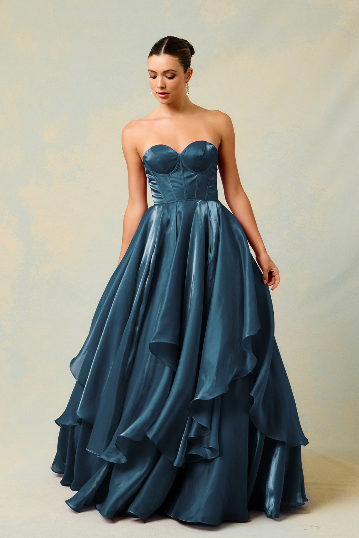 | Vestido elegante de fiesta con diseño tipo princesa, escote corazón strapless y falda amplia, ideal para graduaciones y ocasiones especiales. |