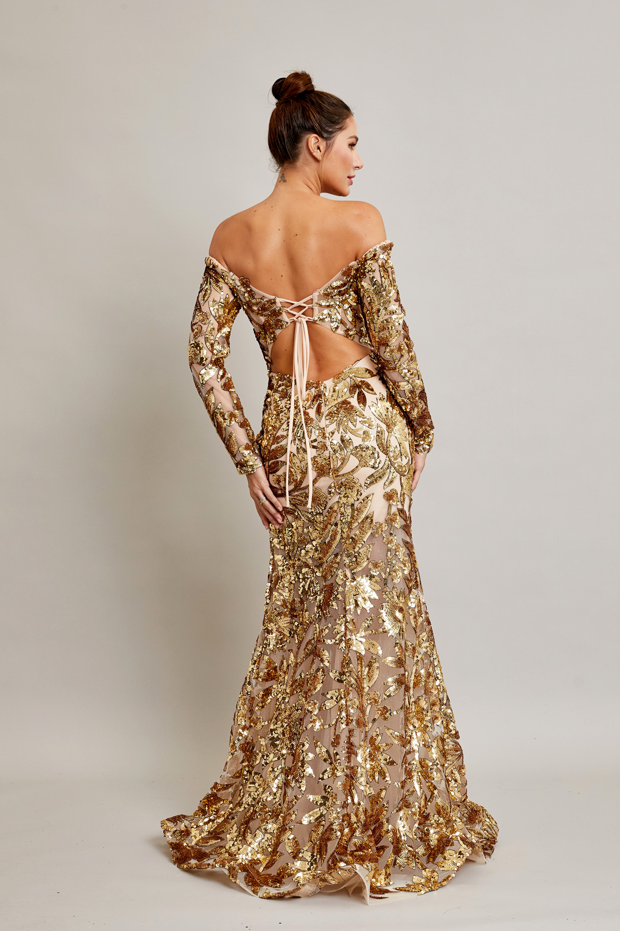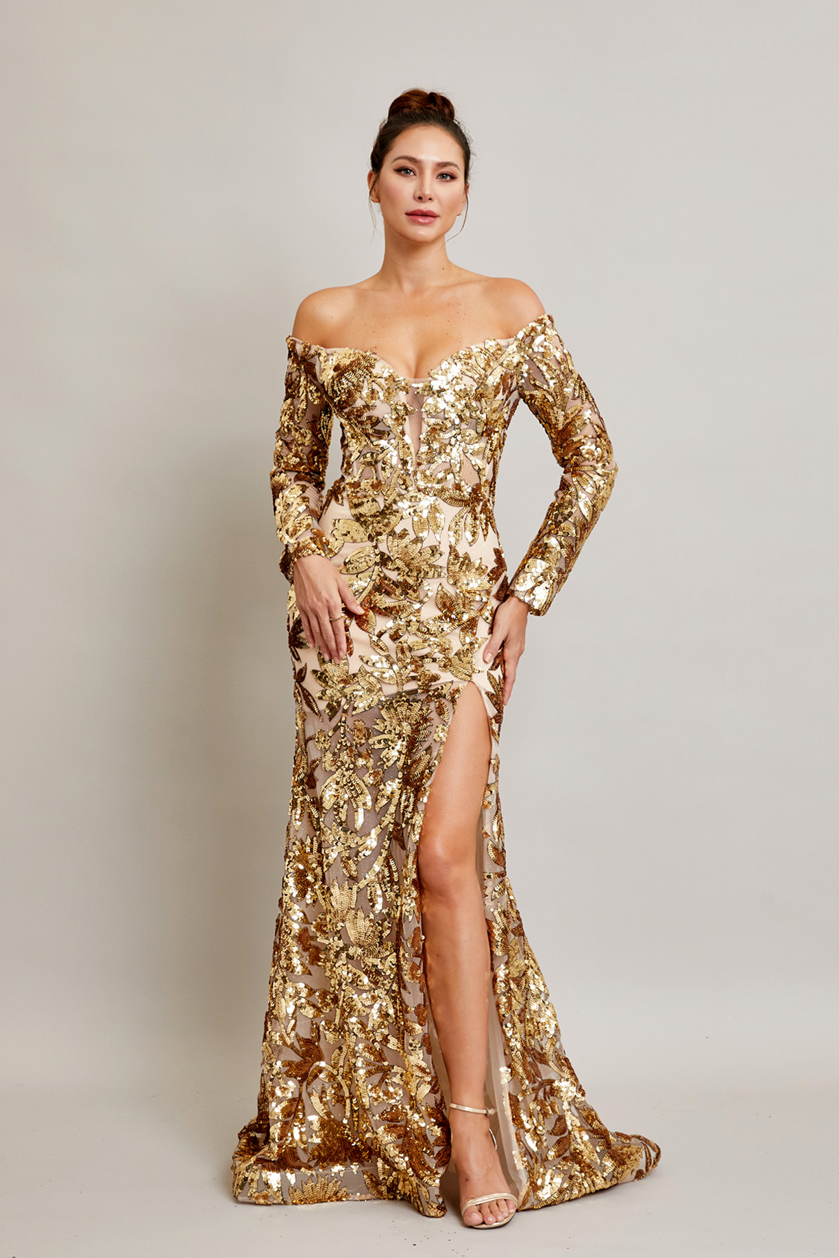 | Vestido elegante de mujer en lentejuelas doradas, manga larga con hombros descubiertos, cuello en V y corte sirena con abertura lateral. |